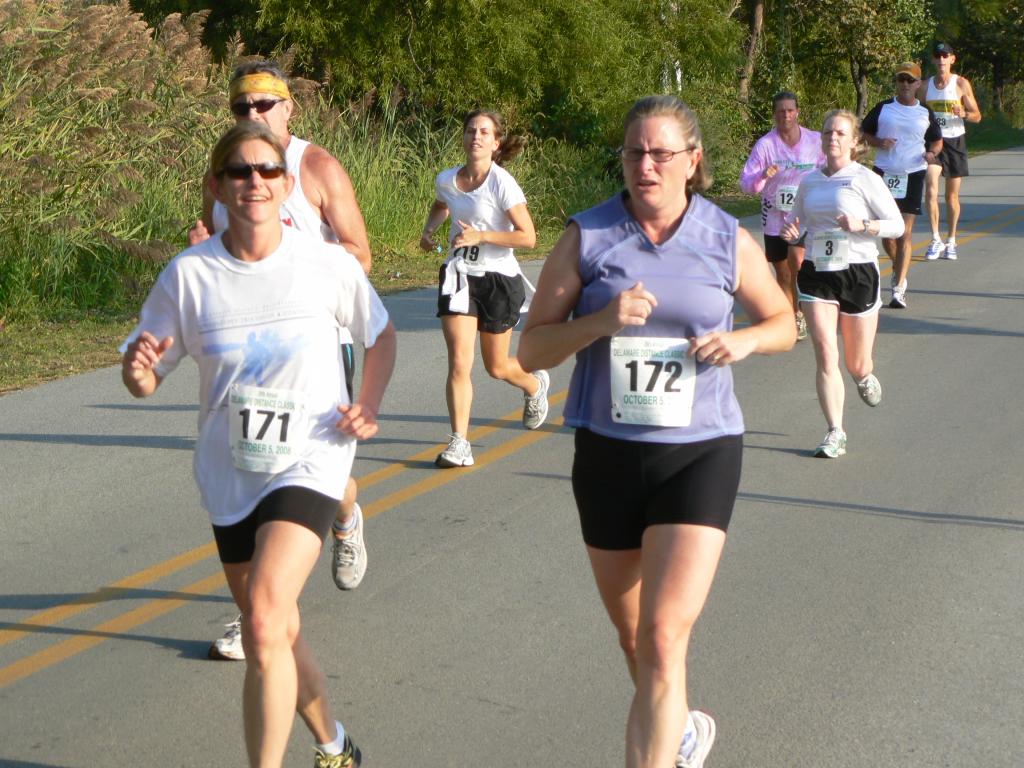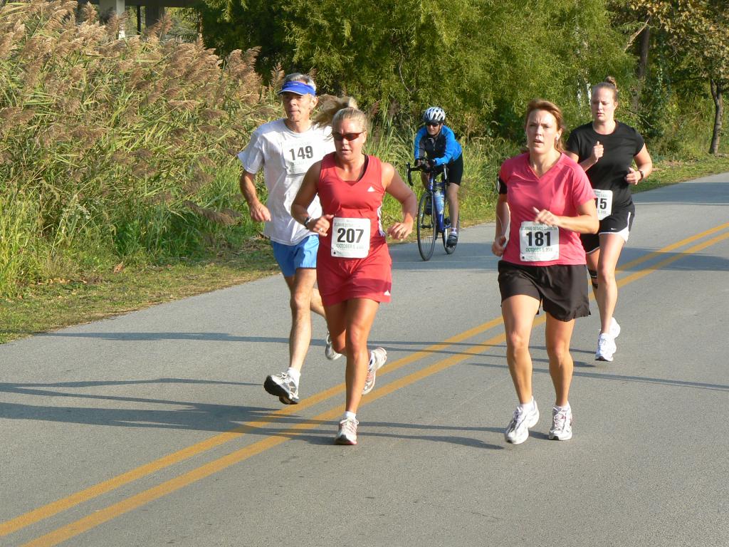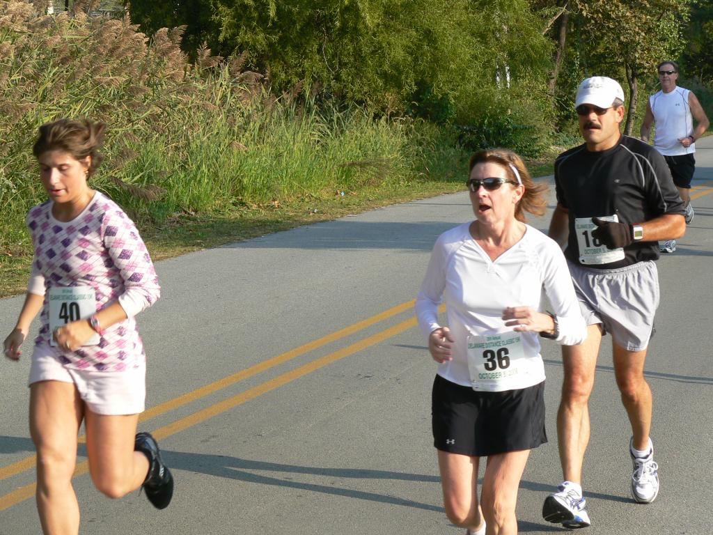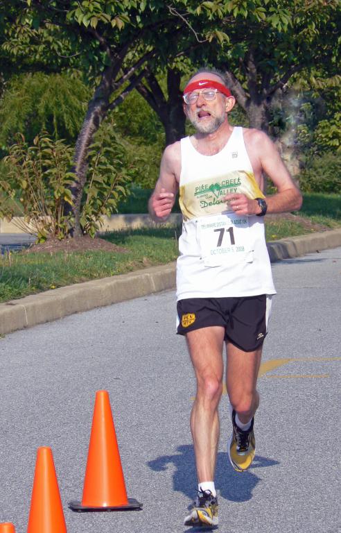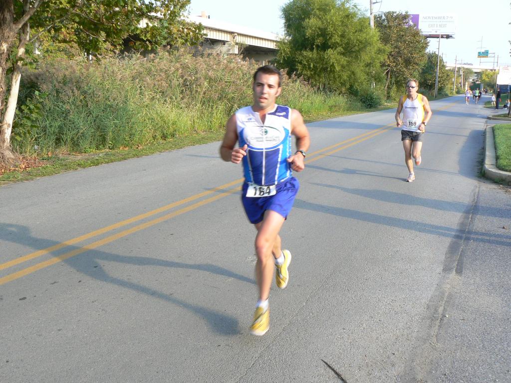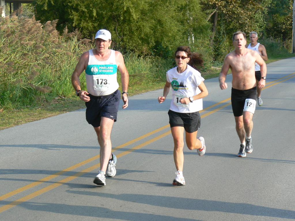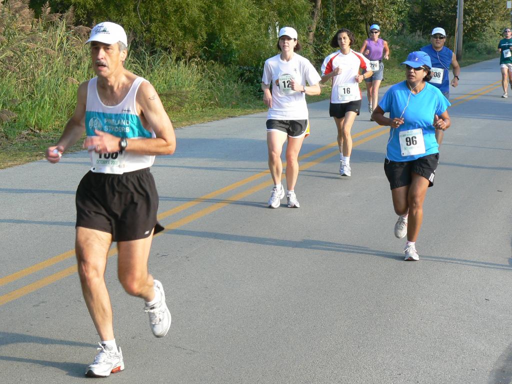 Even with the change in running date(with the second to first Sunday in October), registration was only down slightly with a total of 210 who registered. However, with about 200 actually towing the starting line, about 10% of the field could not complete the course, with 181 actually finishing. With the air temperature being in the upper 60s at the start, it felt cool enough for most runners to take off at their normal paces. But, unfortunately, the dewpoint was almost the same as the temperature, meaning that people heated up within a few miles and started to slow the pace or even overheat and stop. Fortunately no one required medical attention.