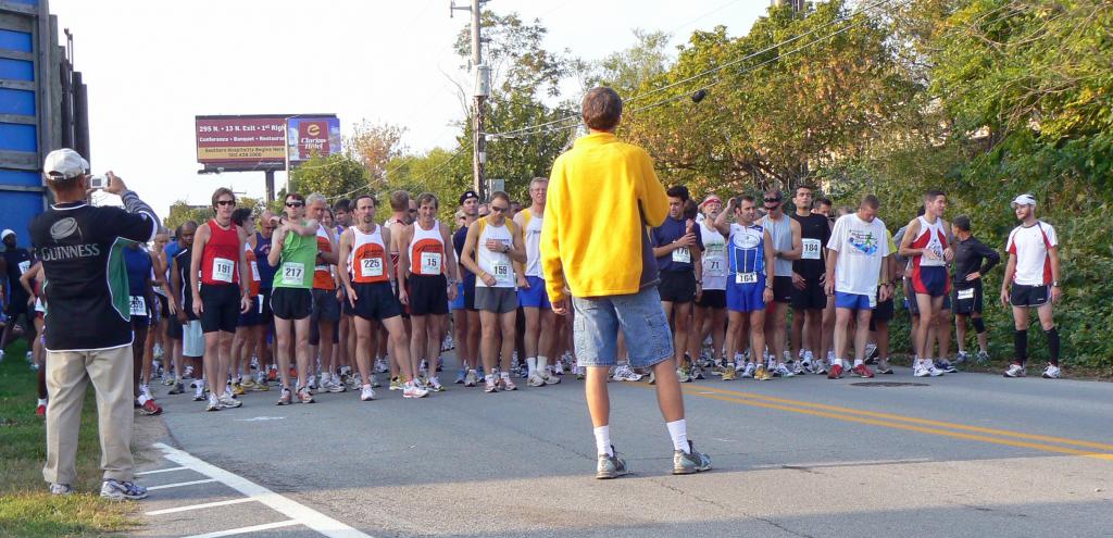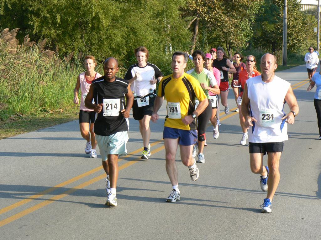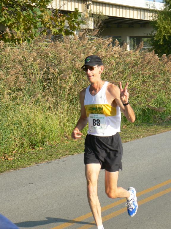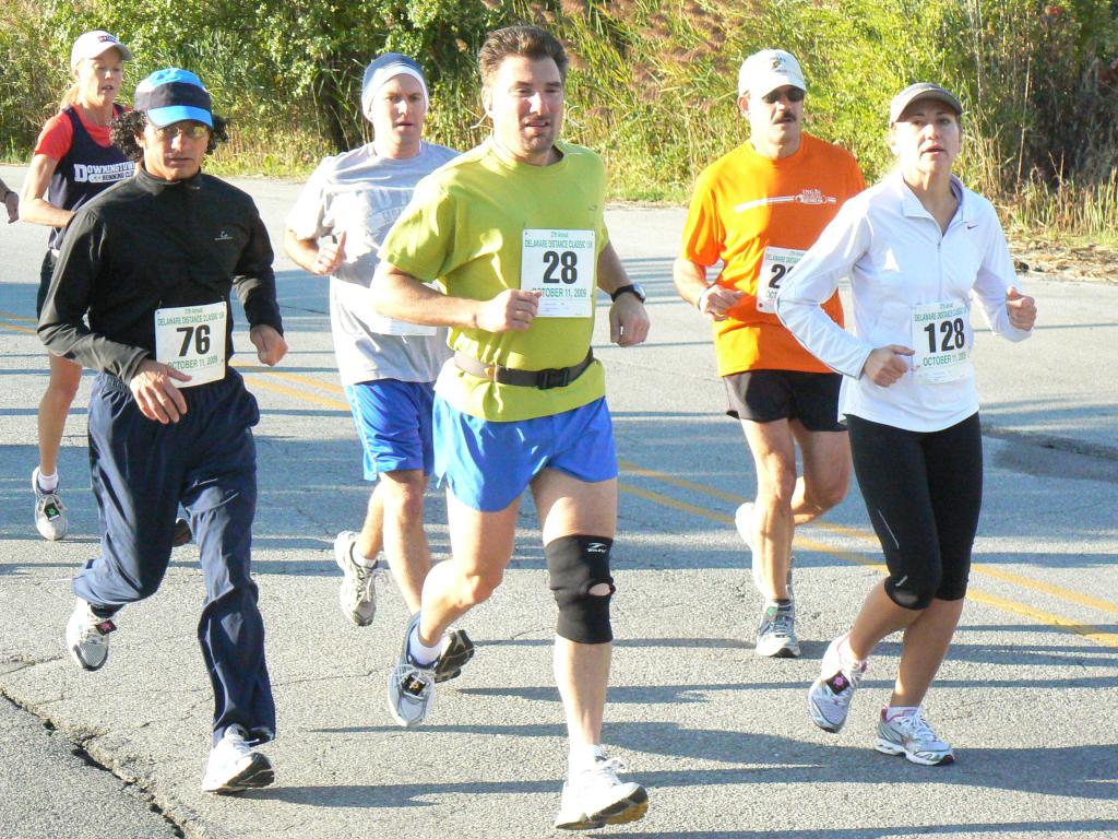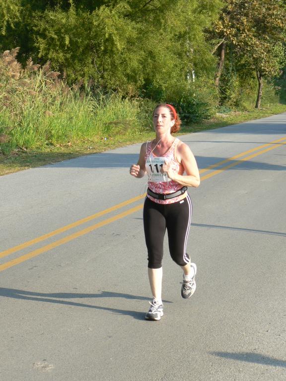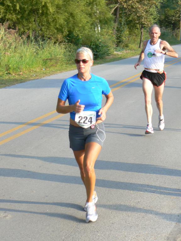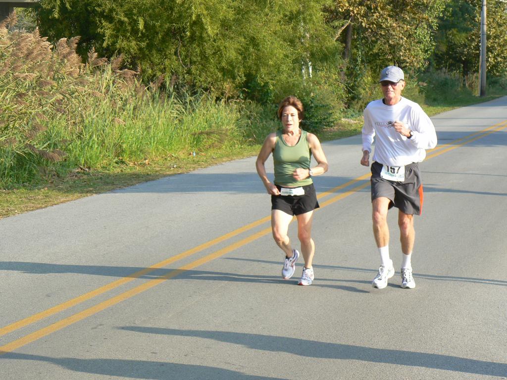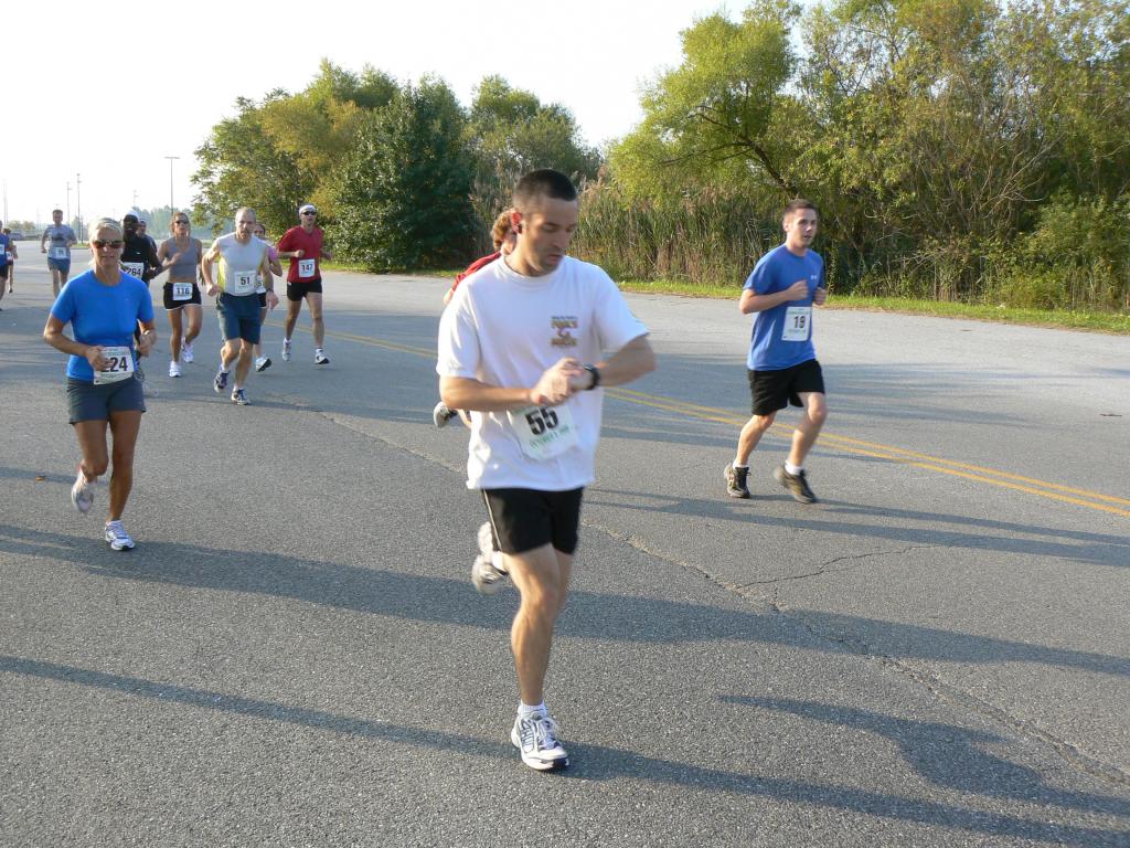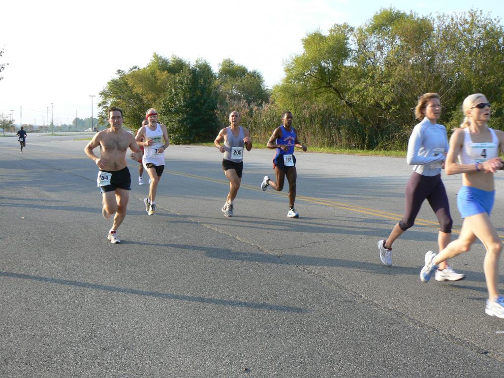 Even with the change in running date(with the second to first Sunday in October), registration was only down slightly with a total of 210 who registered. However, with about 200 actually towing the starting line, about 10% of the field could not complete the course, with 181 actually finishing. With the air temperature being in the upper 60s at the start, it felt cool enough for most runners to take off at their normal paces. But, unfortunately, the dewpoint was almost the same as the temperature, meaning that people heated up within a few miles and started to slow the pace or even overheat and stop. Fortunately no one required medical attention.