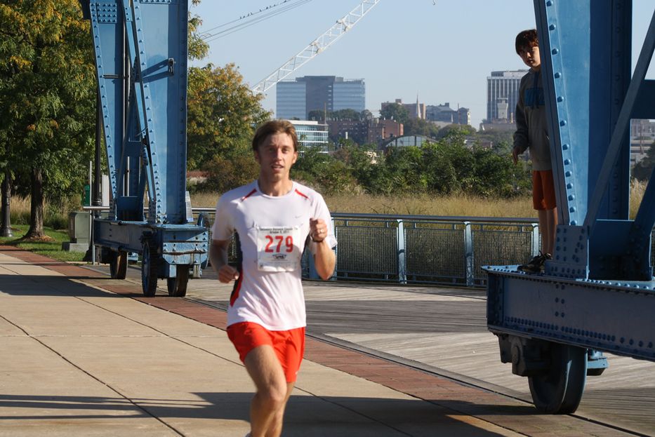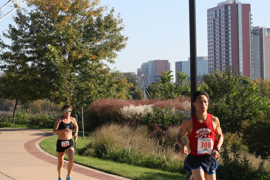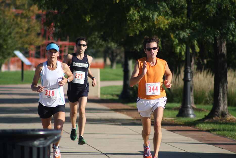 The race itself had good conditions – sunny skies with the temperature in the mid-fifties at the start. It warmed up by the end, but not so warm that people were adversely affected while running. With a car show at the Chase Center and a tent area on S. Madison St, the course had one minor detour into a parking area and over some gravel, into a paved lot and back onto the road. This alteration had been quickly remeasured and the course certified by Doug White several days before the race.